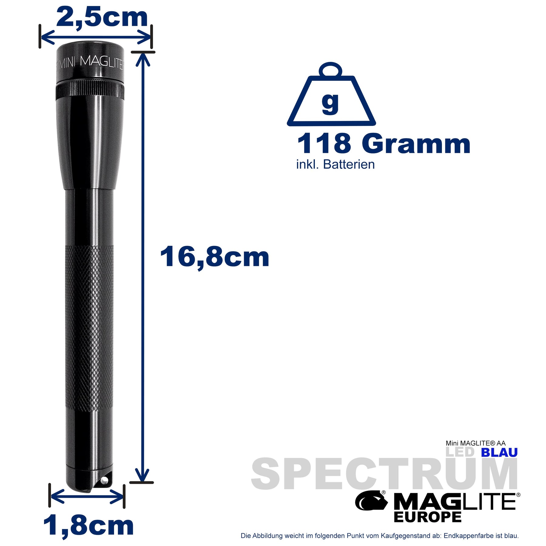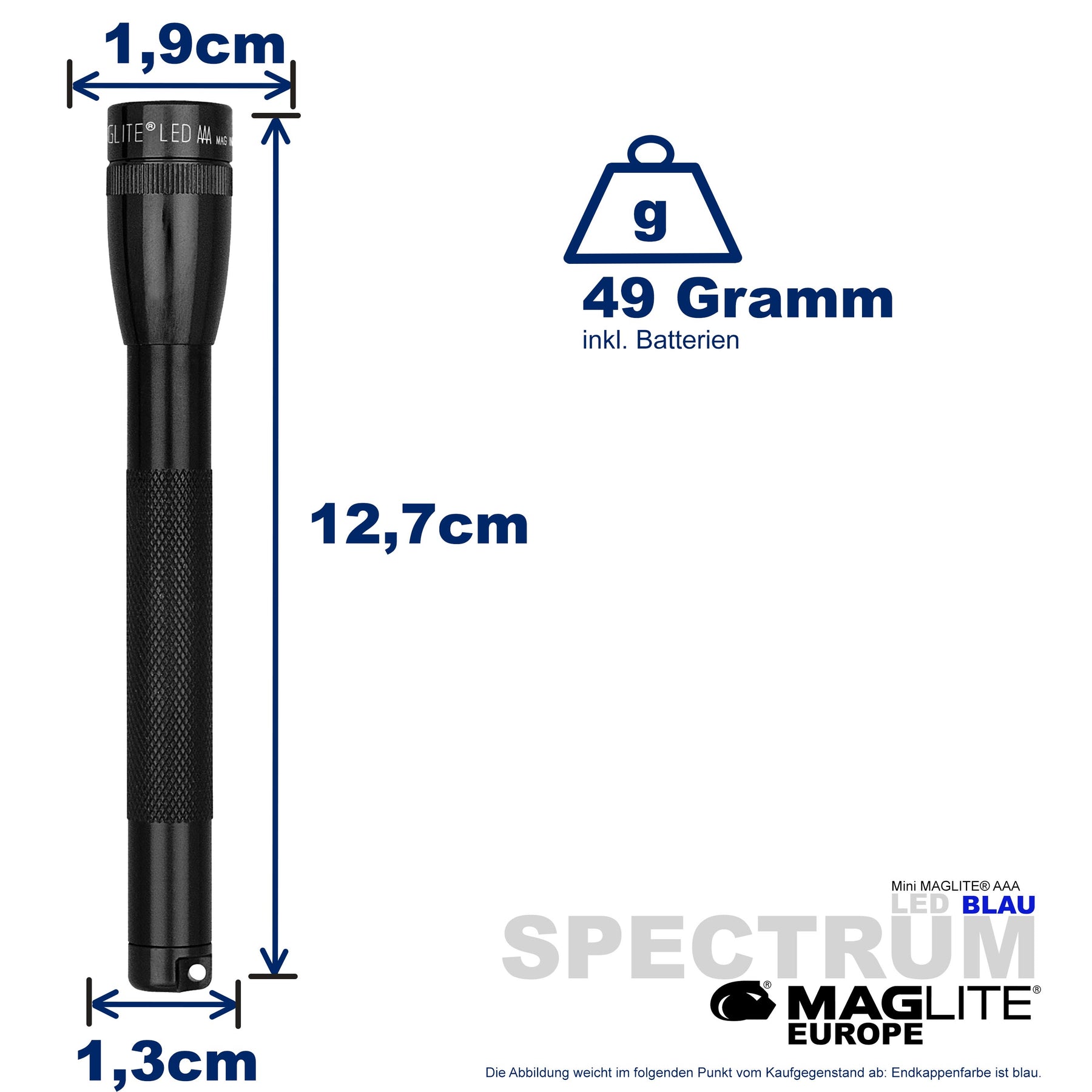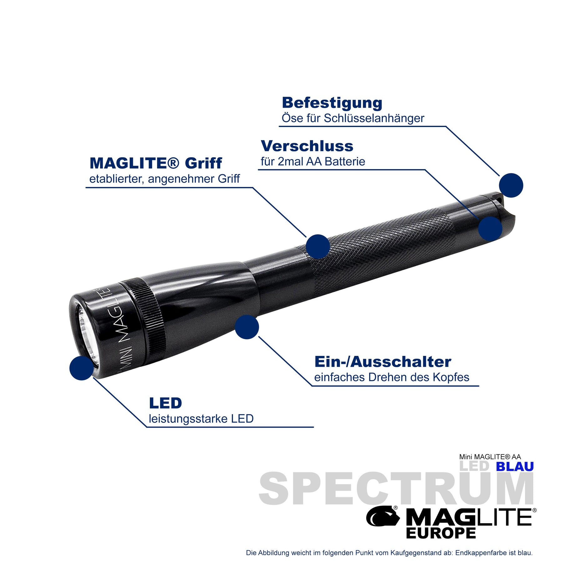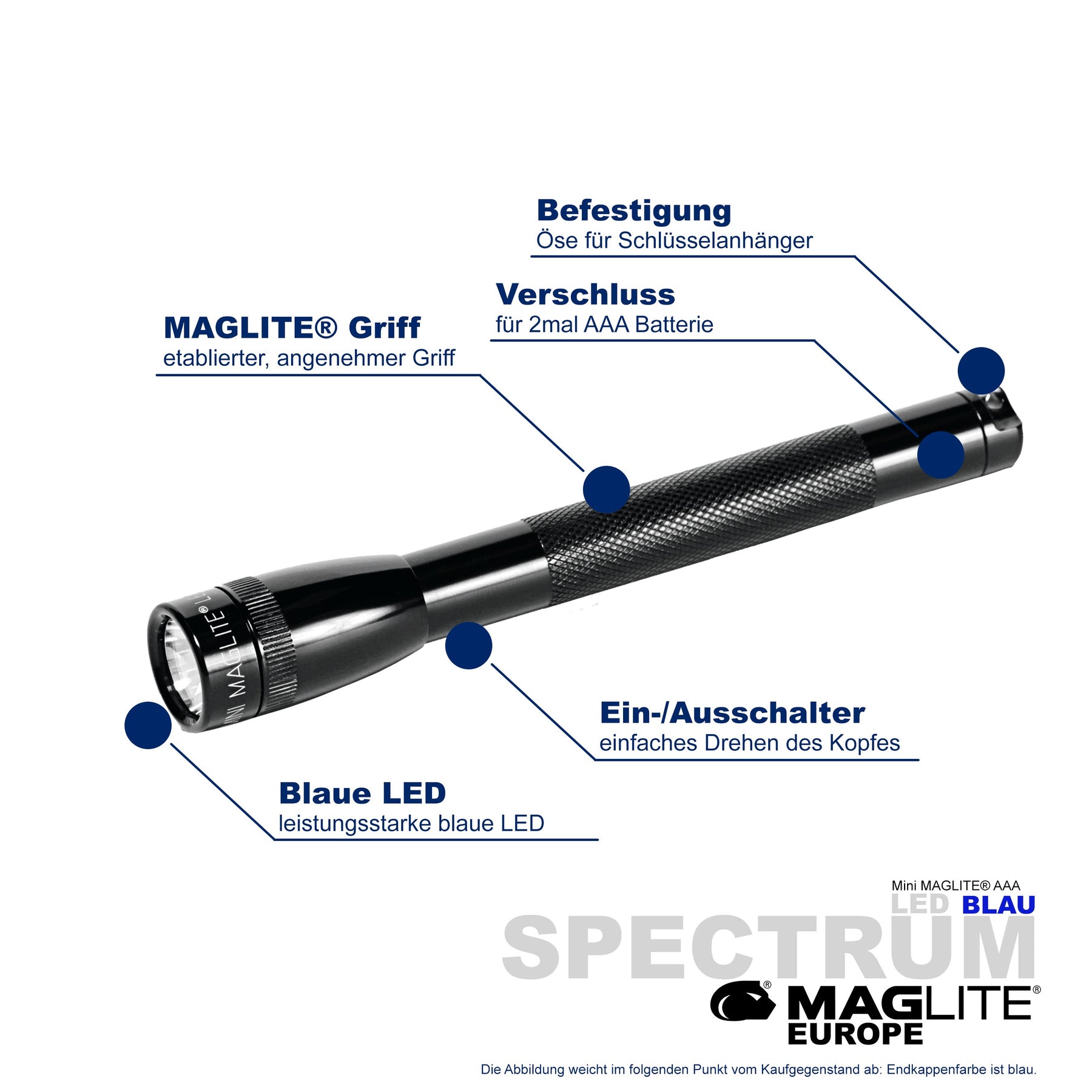 Maglite® Spectrum Series™ met blauwe LED heeft een blauwe LED-lichtstraal.